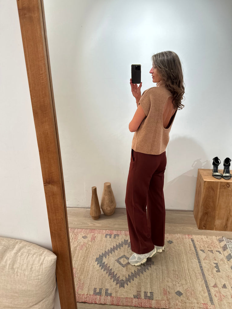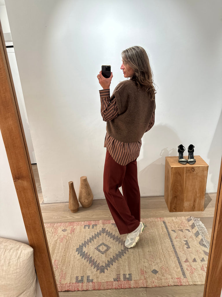 Our Andrée long pant has a timeless straight cut, structured by folds, which creates an assured look. The waist is highlighted by a belt, the pockets bring a functional and elegant note.