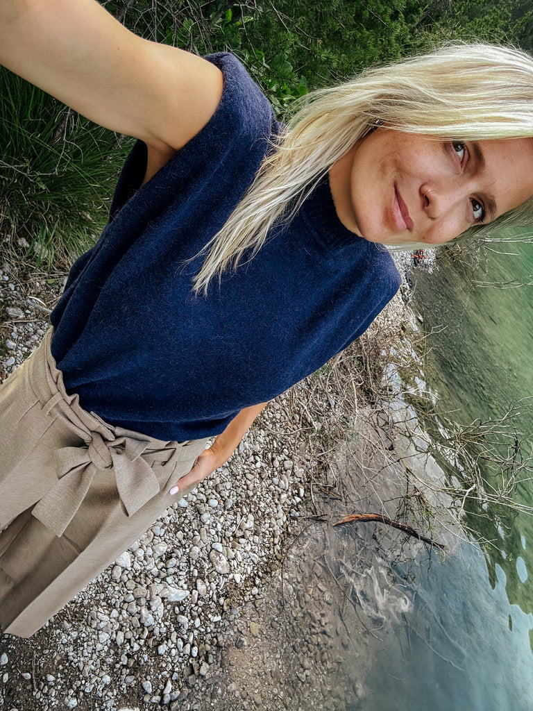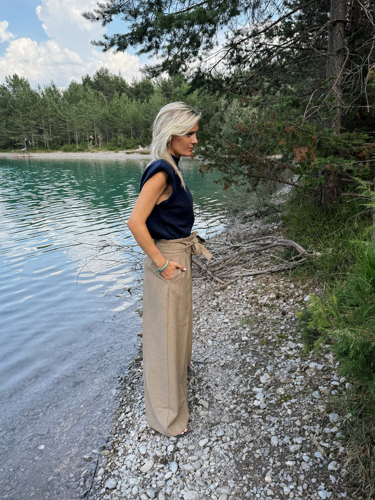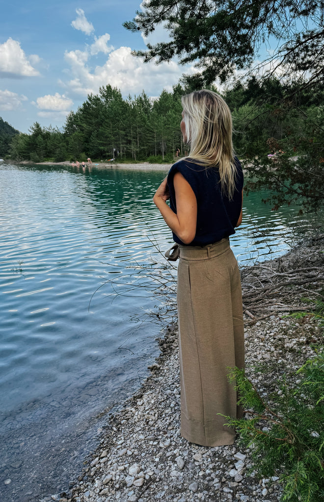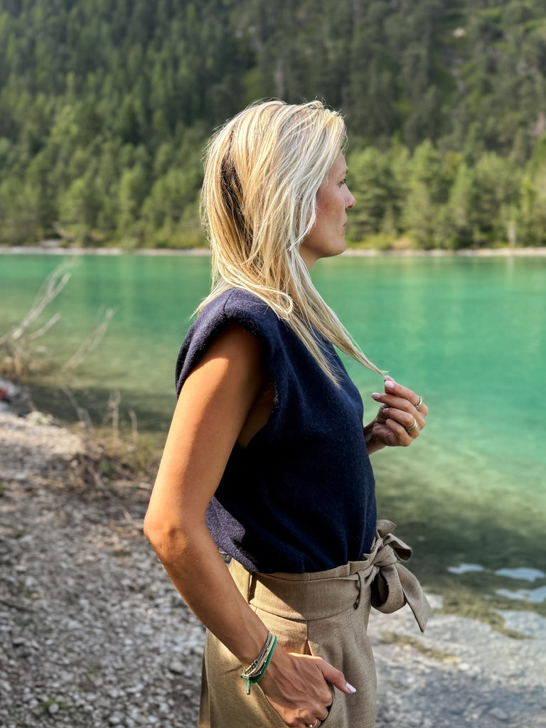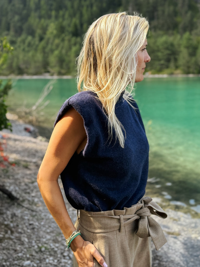 BOY is a sleeveless knitted sweater, with a structured look. Its straight cut, marked shoulder pads and high collar give it a very assertive look. To be worn over a flowing shirt such as the INDIANA silk shirt or a fitted t-shirt, it structures the silhouette in a flash. A winter essential that plays on overlays.