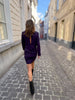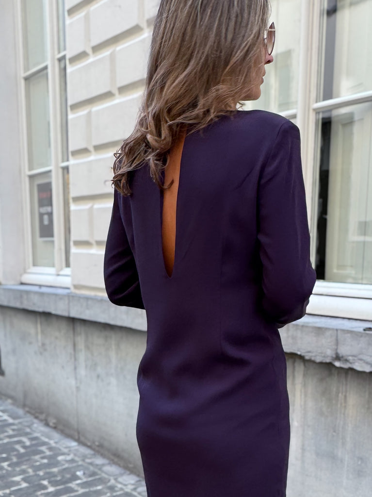 How can you resist the allure of our Marcus short dress? Glamorous and sophisticated, its fitted cut enhances your silhouette, while its mini length adds a touch of sensuality to your outfit. This design stands out with its long sleeves slightly structured shoulders, bringing both elegance and structure. It is made from a material partially composed of silk. This short dress features a delicately rounded neckline that sits close to the neck. At the back, a subtle slit at the center fastens discreetly with a small button at the nape.