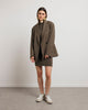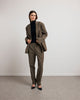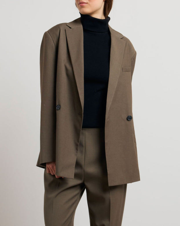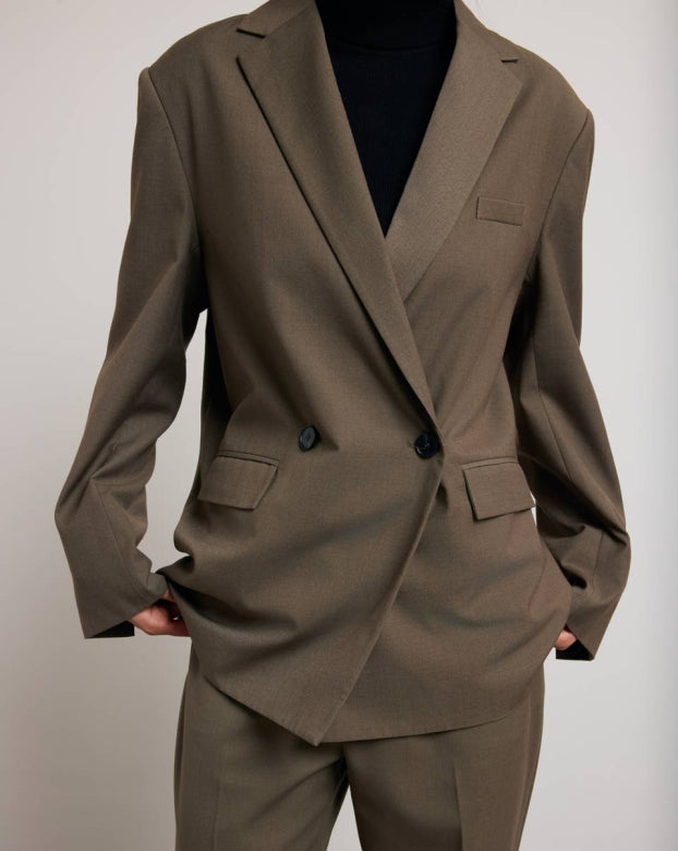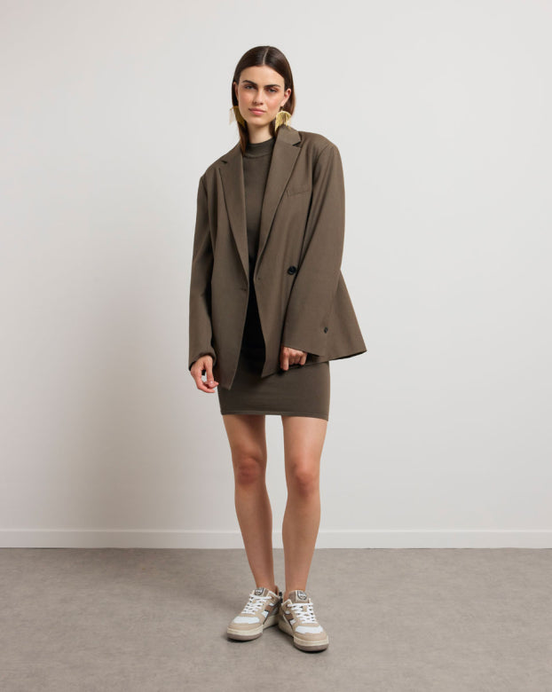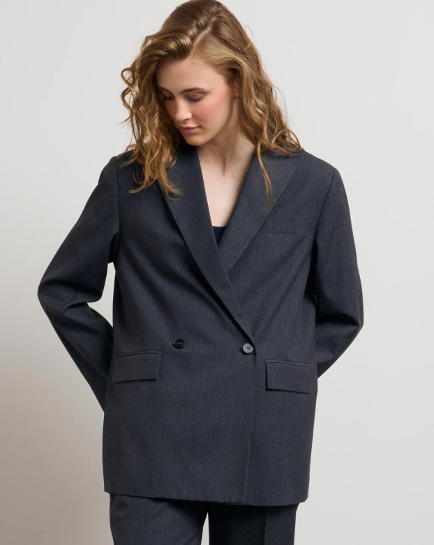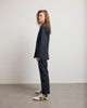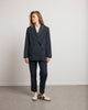 The JEAN jacket draws from the codes of the masculine wardrobe to create a contemporary and assertive silhouette. Its straight cut, slightly oversized, structures the outfit with precision. The crossed buttons and patch pockets add a touch of character to its sleek line.