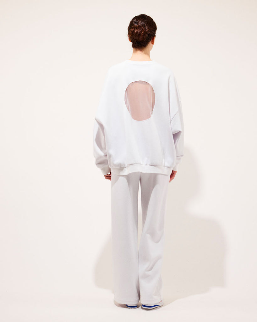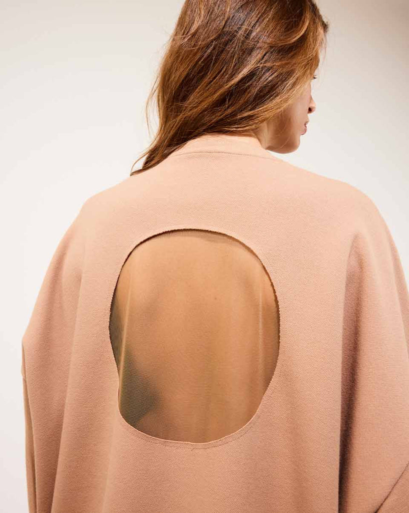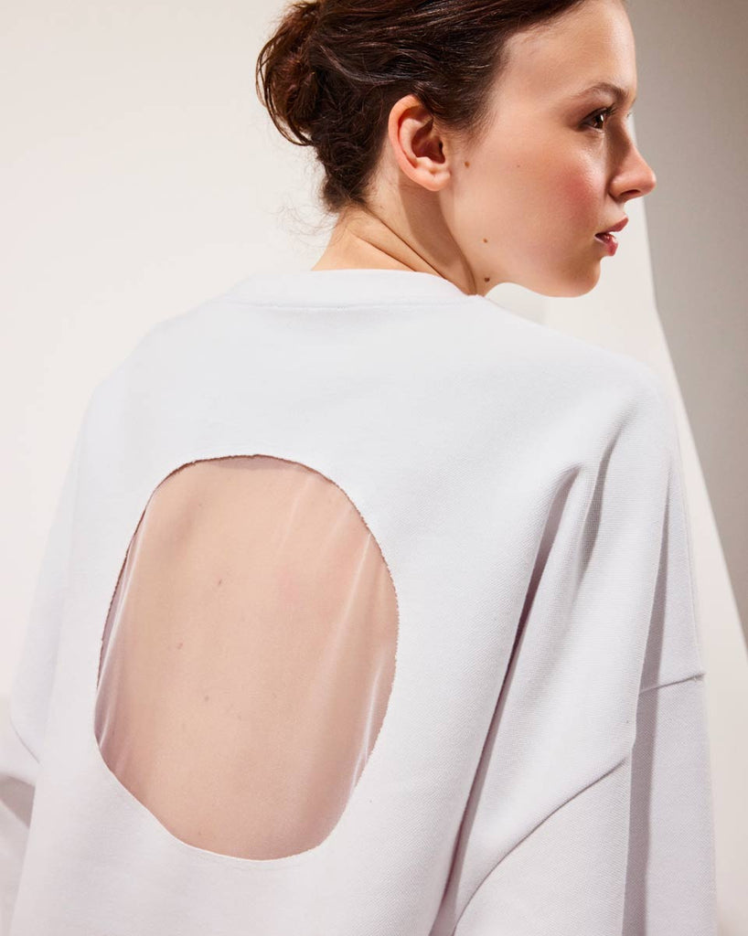 Very cool oversized sweater with a mesh open back.