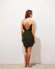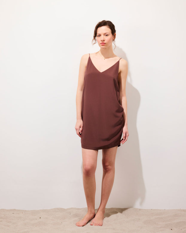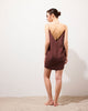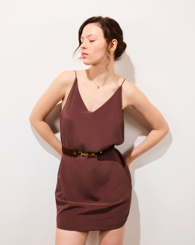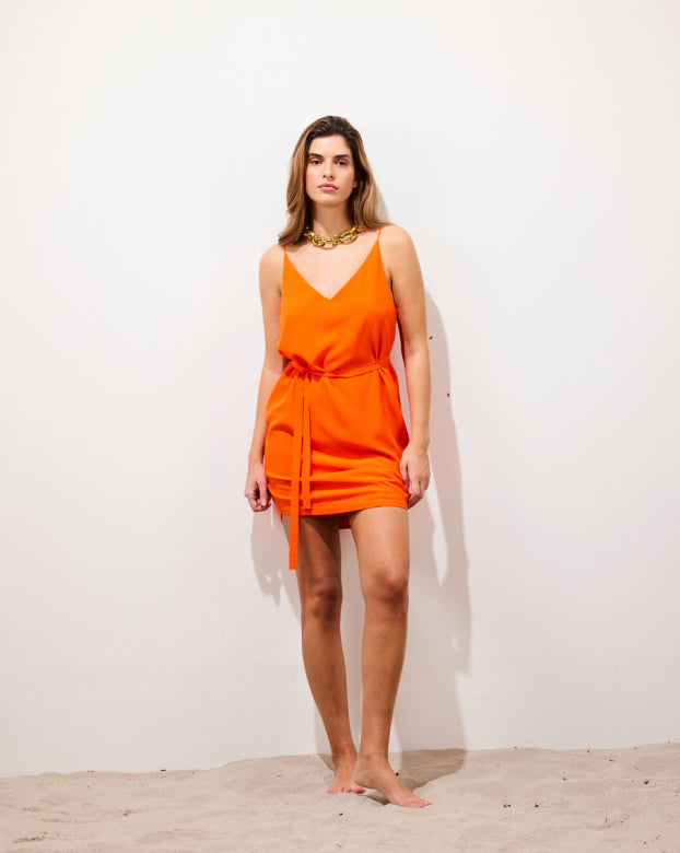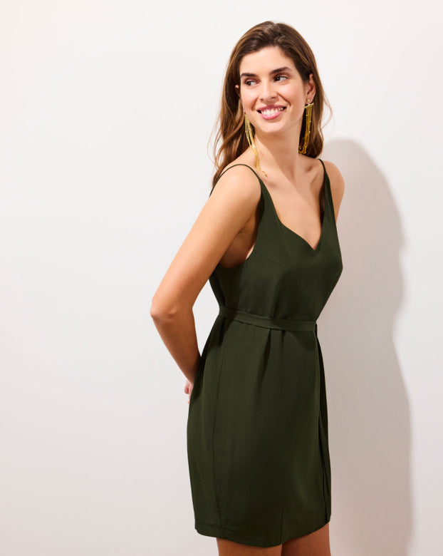 Beautiful silk short dress with V-neckline and open back. Can be worn with or without the belt.