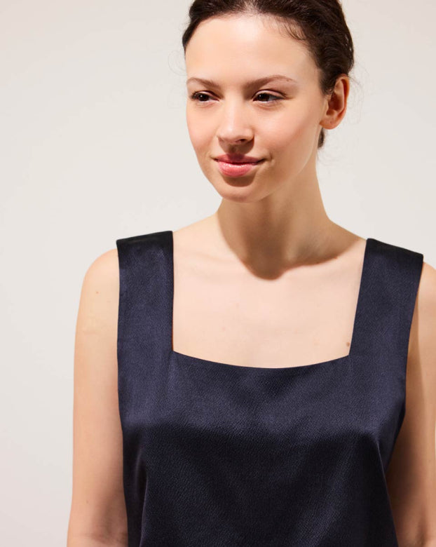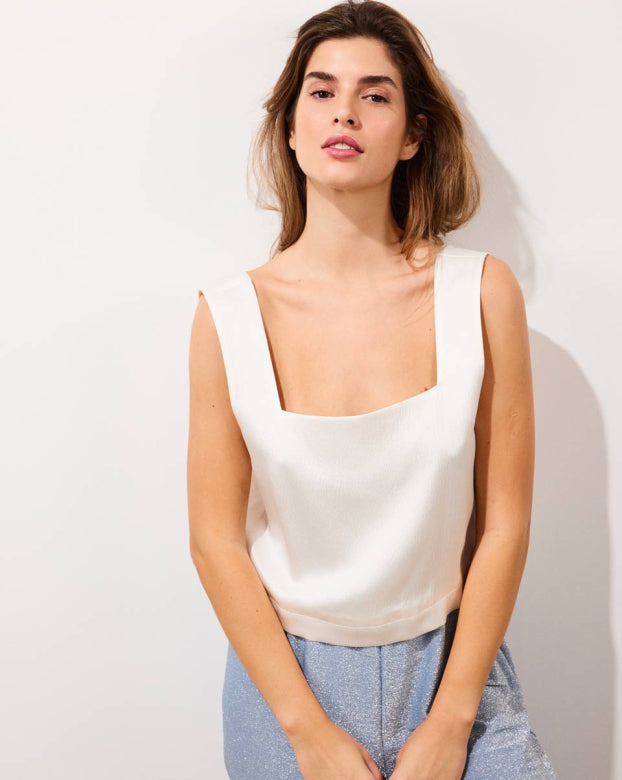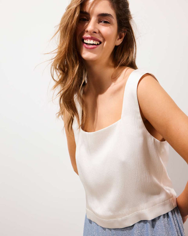Versatile and chic, our TEXAS top boasts a fairly short square shape that adapts to every occasion. Made from embossed silk for shine and elegance, it pairs effortlessly with jeans for a casual look or our one our silk trousers for a classy and elegant ensemble.