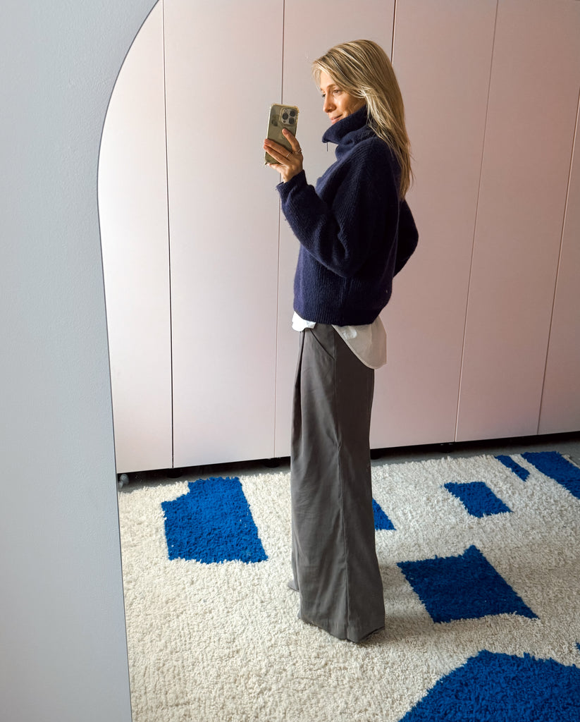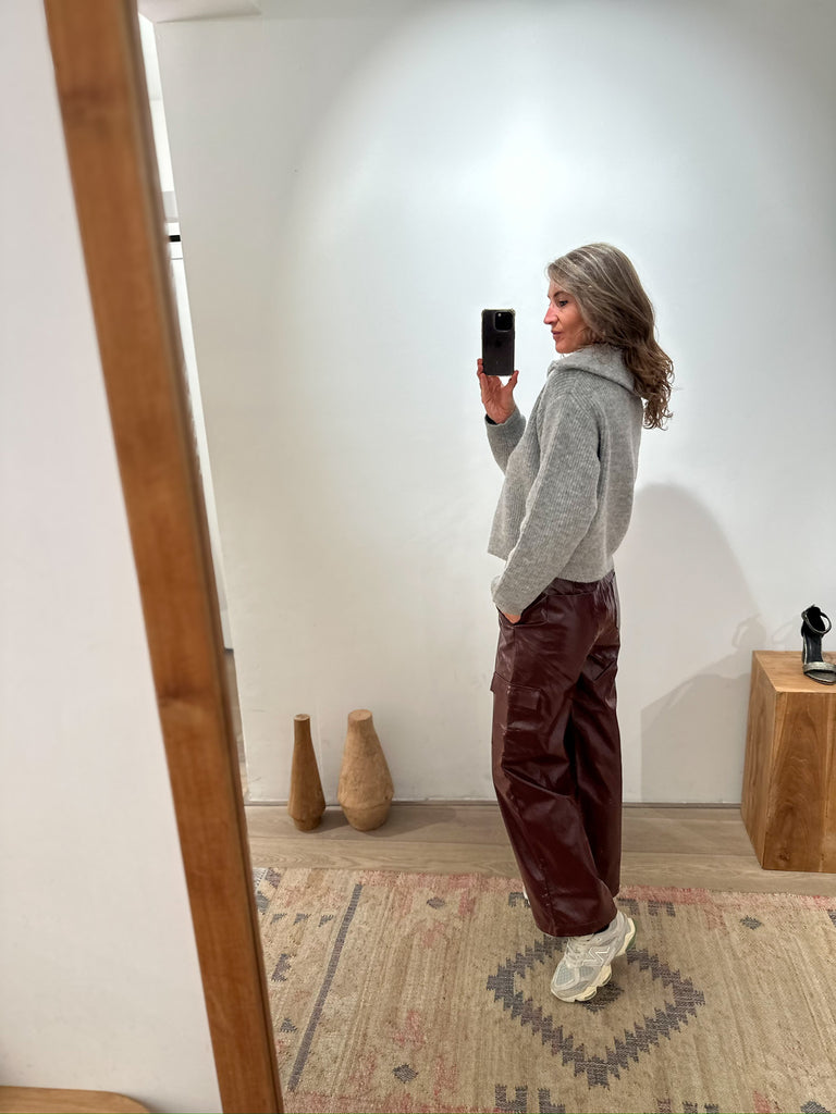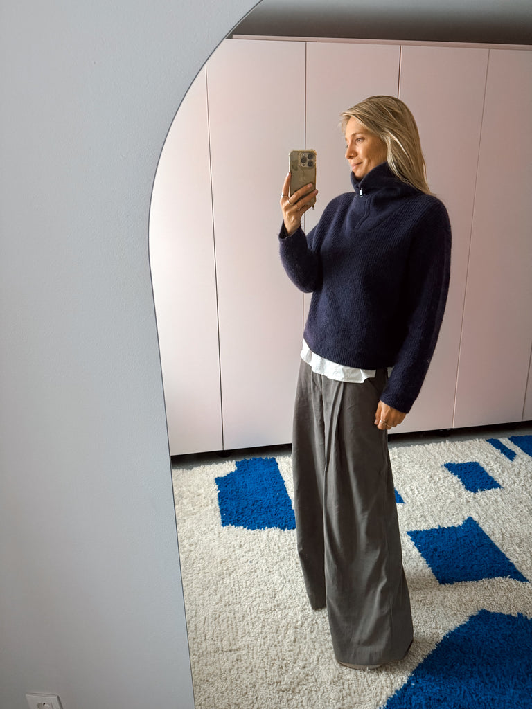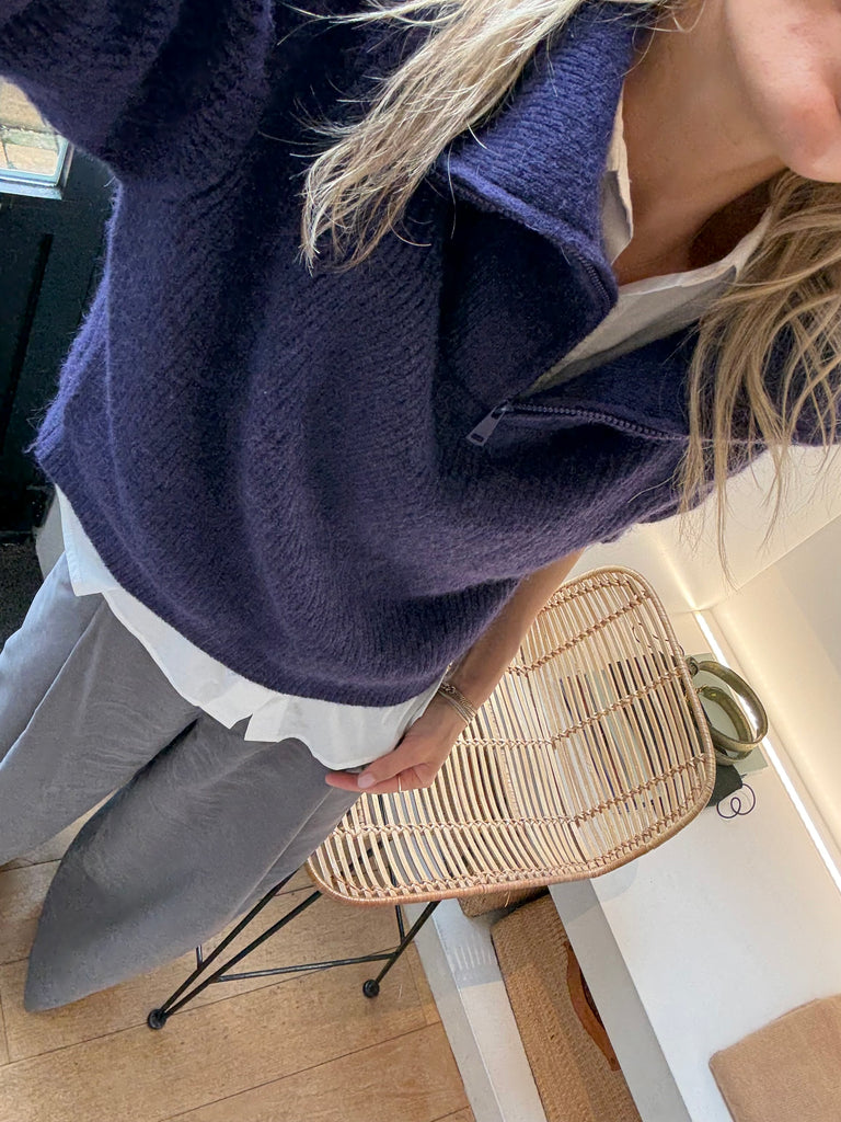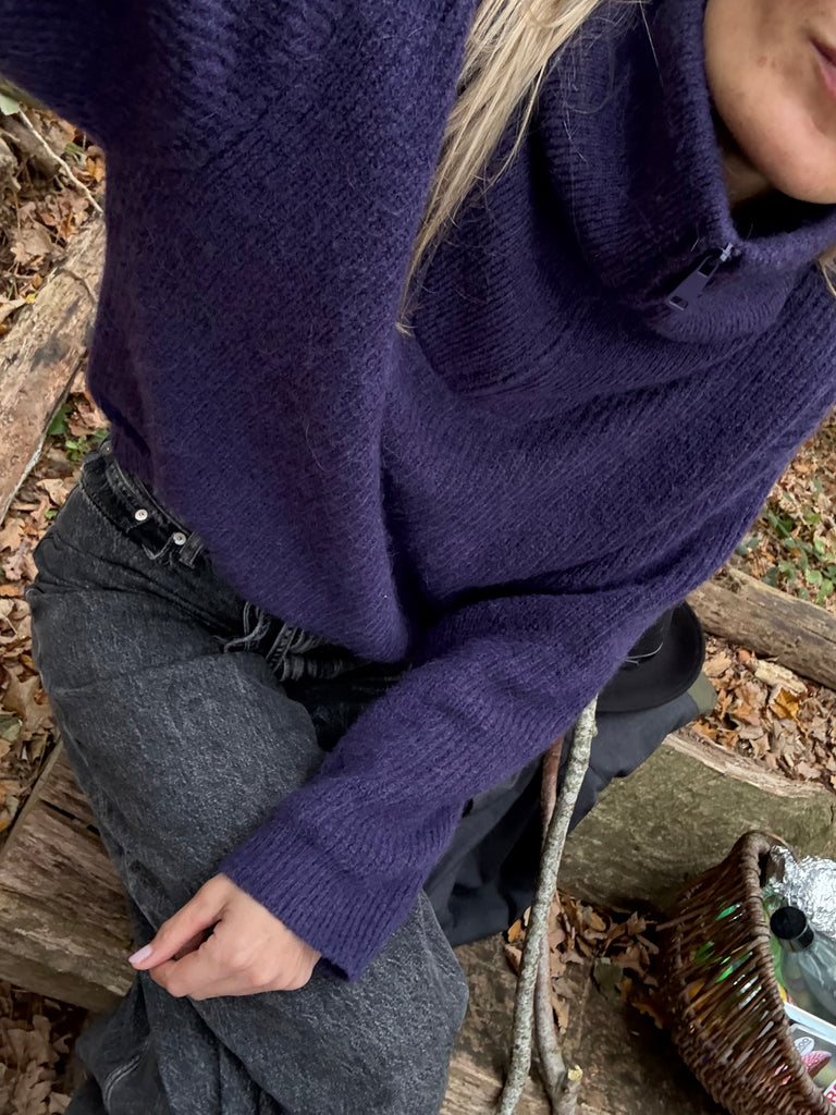 Soft and short knitted sweater with zipper and reversed collar.