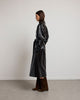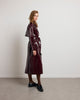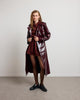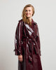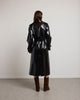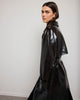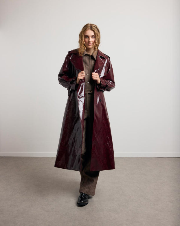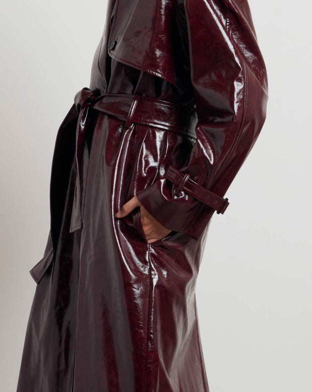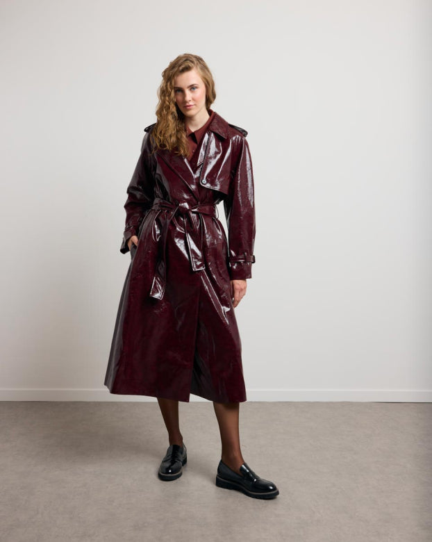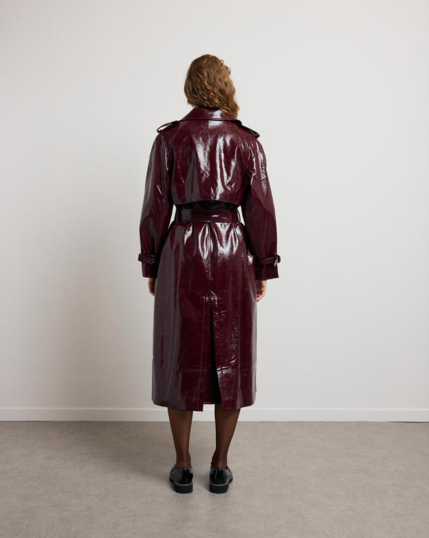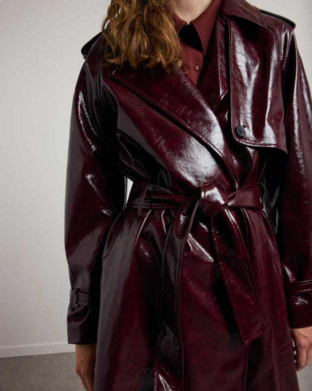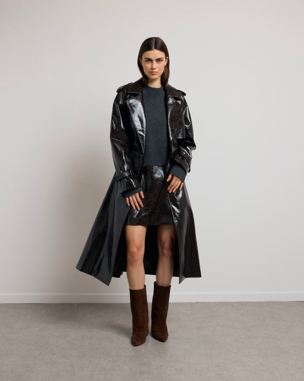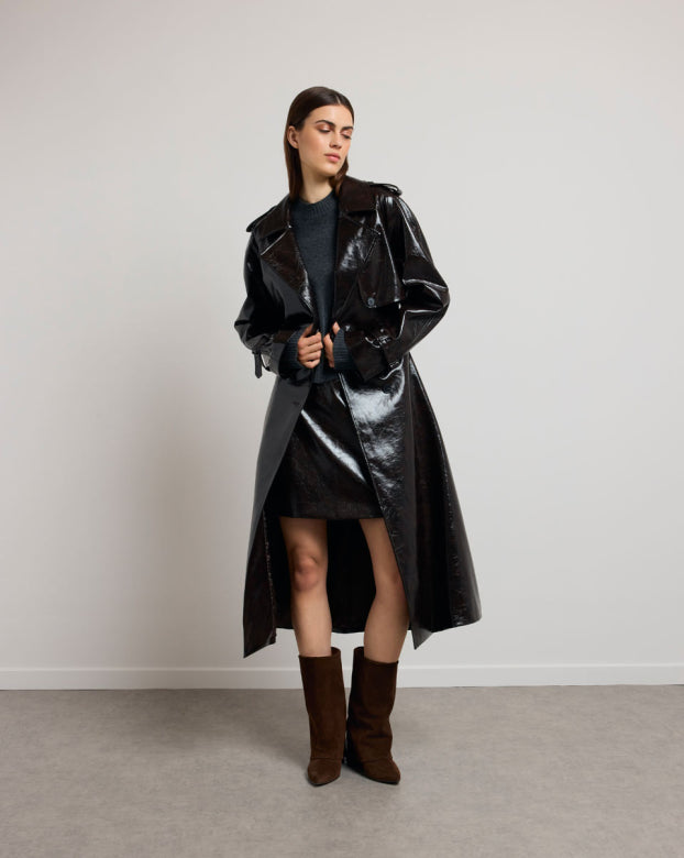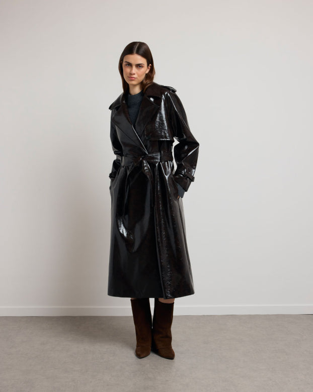 The BASILE vinyl trench coat revisits the codes of classic peacock with a bold touch, carried by its shiny material with structured fall. Its loose fit, highlighted by marked shoulders and a wide collar, outlines a powerful and assertive silhouette. The belted finishes, legs and flaps evoke Gabardine inspiration, while the brilliance creates a play of light. Designed as a strong piece of the winter wardrobe, it can be worn open or belted, depending on the desired look.