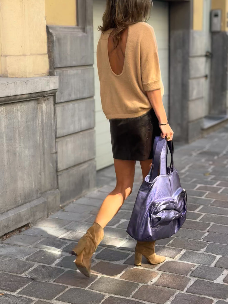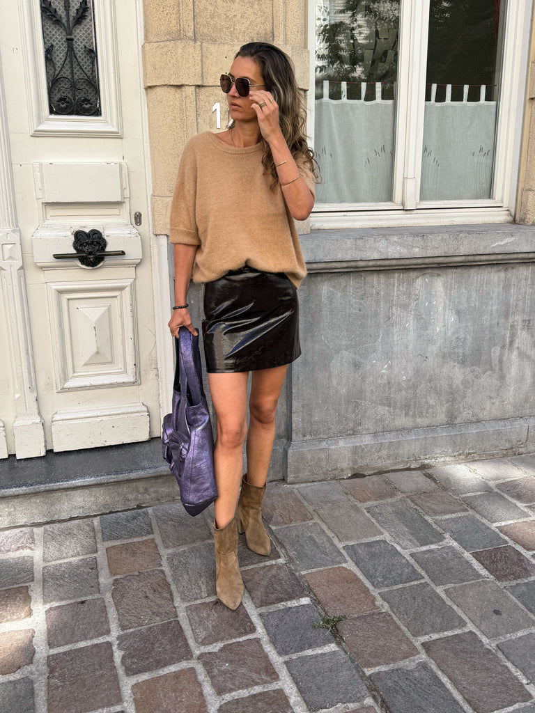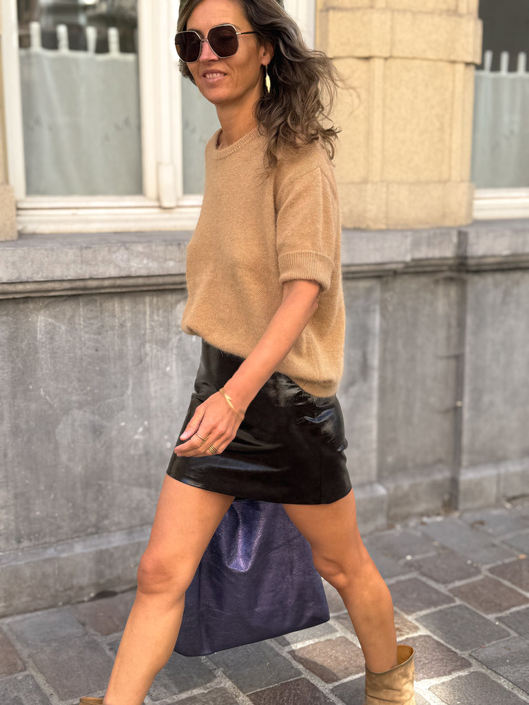 The BASILE vinyl skirt is a piece with a strong look, designed for the city. Its straight and short cut creates a structured silhouette. The button placed on the side and the invisible closure sign a minimalist design. The darts on the back sculpt the lines for an elegant silhouette without rigidity. Wear with a loose knit for a more casual style, or as a total look with the BASILE vinyl jacket for a bold and assertive silhouette.