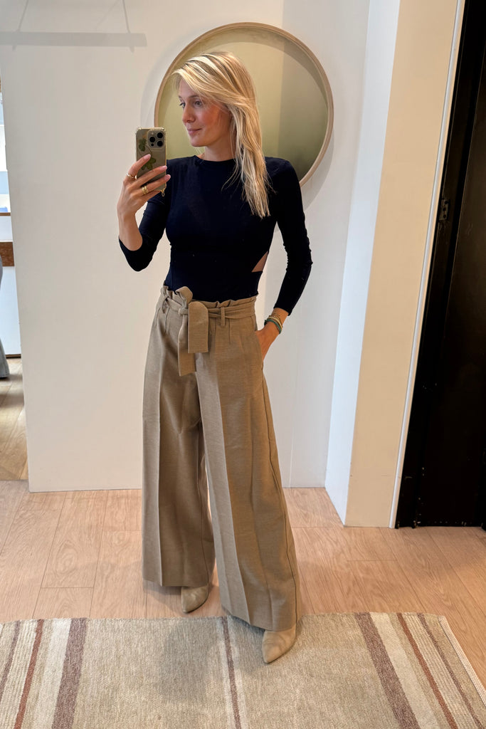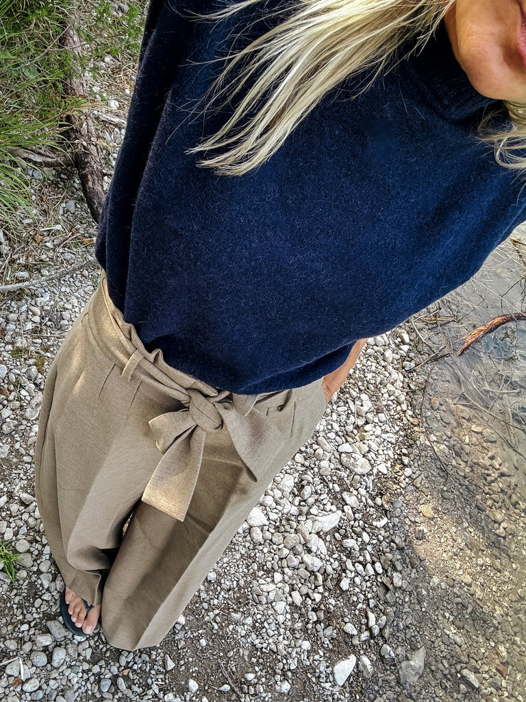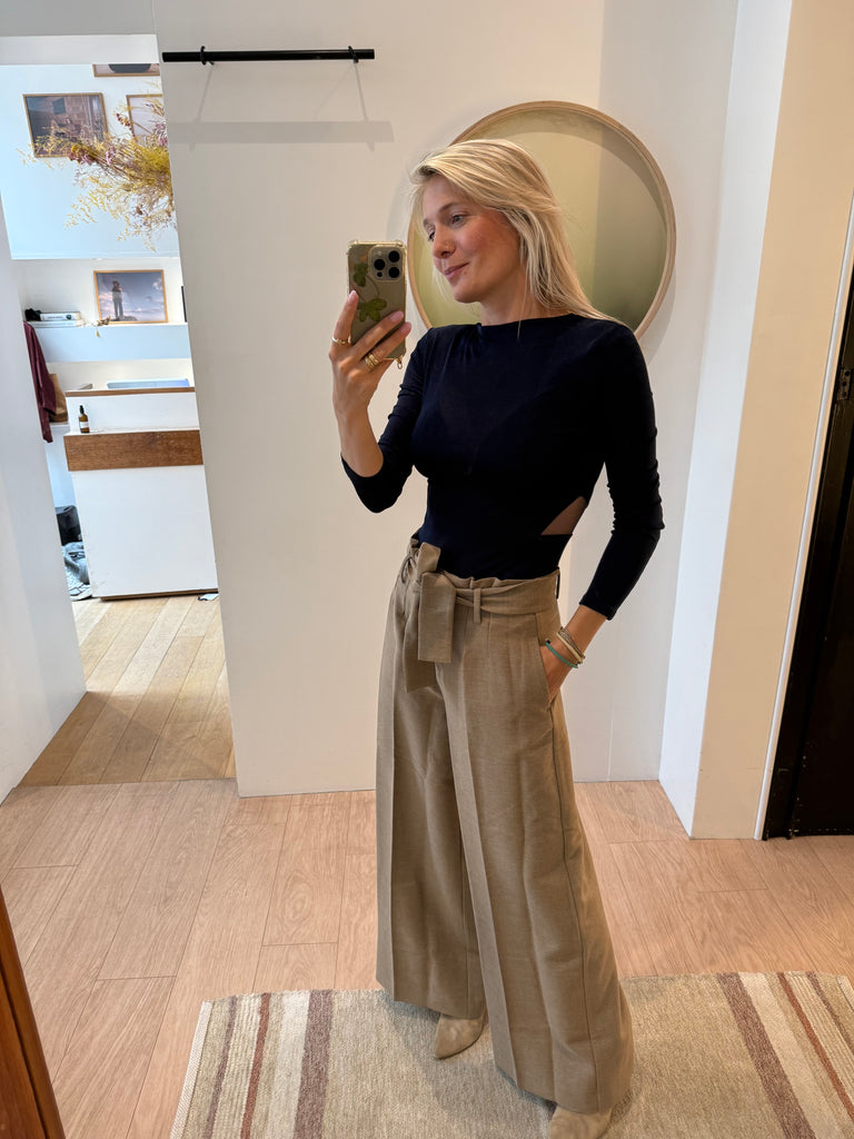 The JEANNE trousers elongate the silhouette with fluidity and precision. Its straight cut and wide structure the look while offering a beautiful freedom of movement. The high waist is marked by a removable belt to tie, naturally highlighting the curves. Darts at the front bring a "suit" touch to the trousers. An essential of the wardrobe, to wear with a satin blouse as well as a sweater.