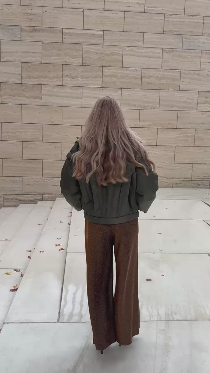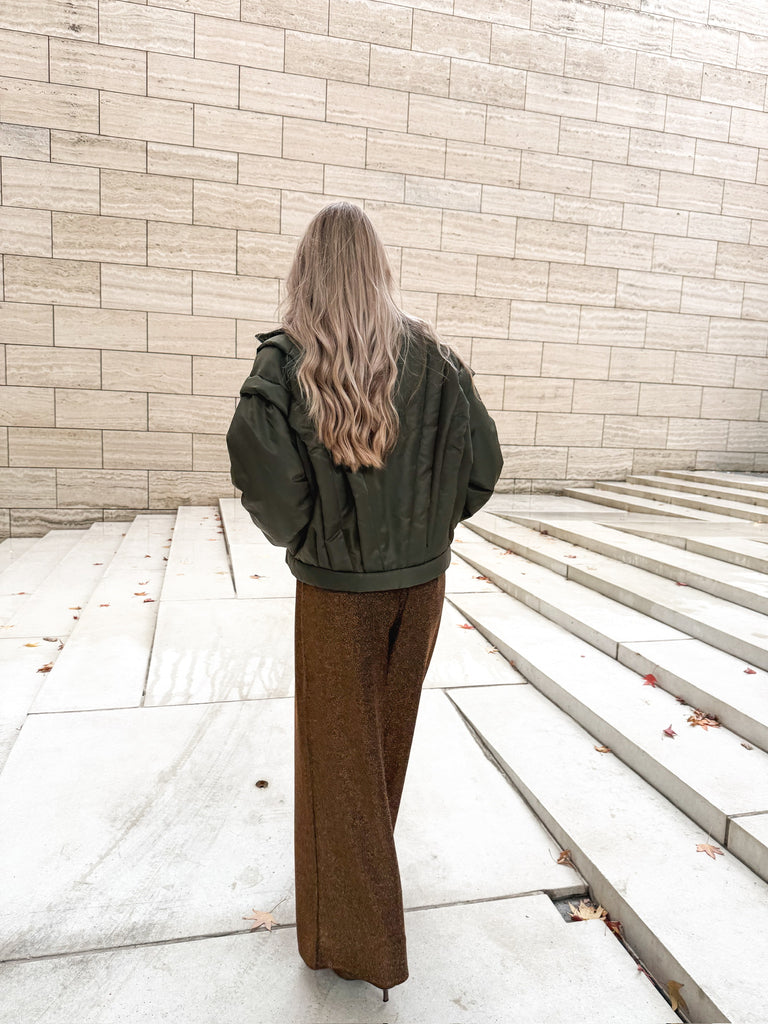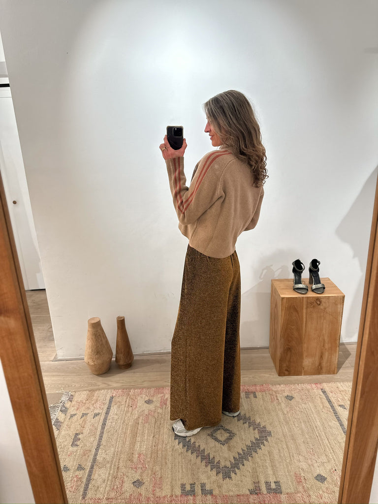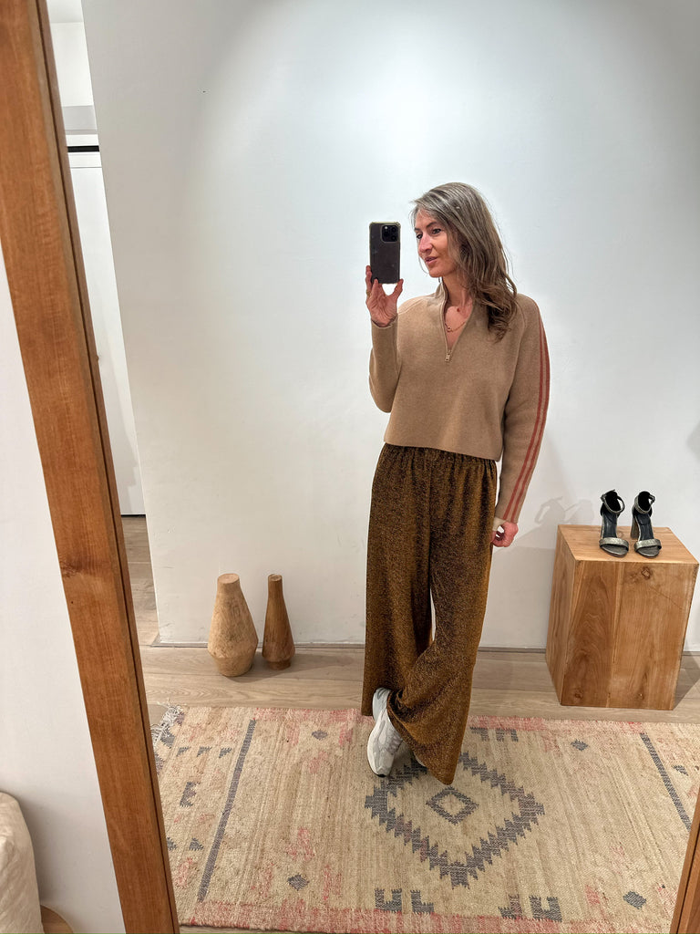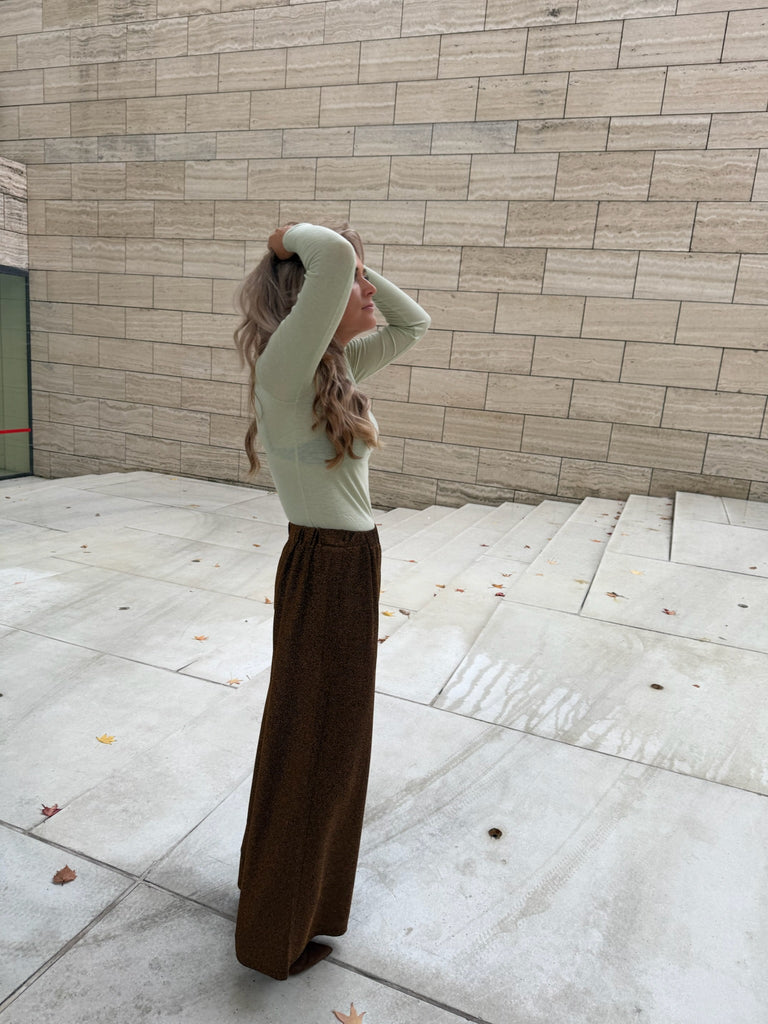 Fluid and soft pants with a wide cut. This model is has an elastic in the waist and is worn mid-waist.