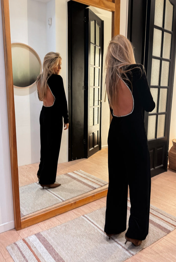 The SPICE long jumpsuit is a bold and modern model. Its open oval back adds a unique and elegant touch to your outfit. Made from luxurious velvet, it offers a soft touch and a sophisticated look. Perfect for special occasions, this jumpsuit creates a striking and glamorous look. Pair it with high heels for a slender and elegant silhouette, or combine it with sparkling accessories for an unforgettable evening look.