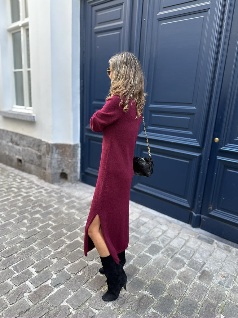 Inspired by our best-seller, the Lauper sweater, this long dress in fluffy knit offers warmth and absolute comfort. Its long-sleeved straight cut draws a relaxed silhouette, while the deeper U-back neckline gives it a discrete sensuality. Two lateral slots come to lighten the line and give movement to this dress. Fully reversible.