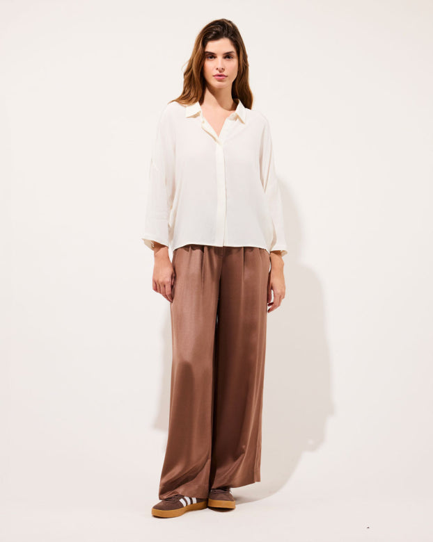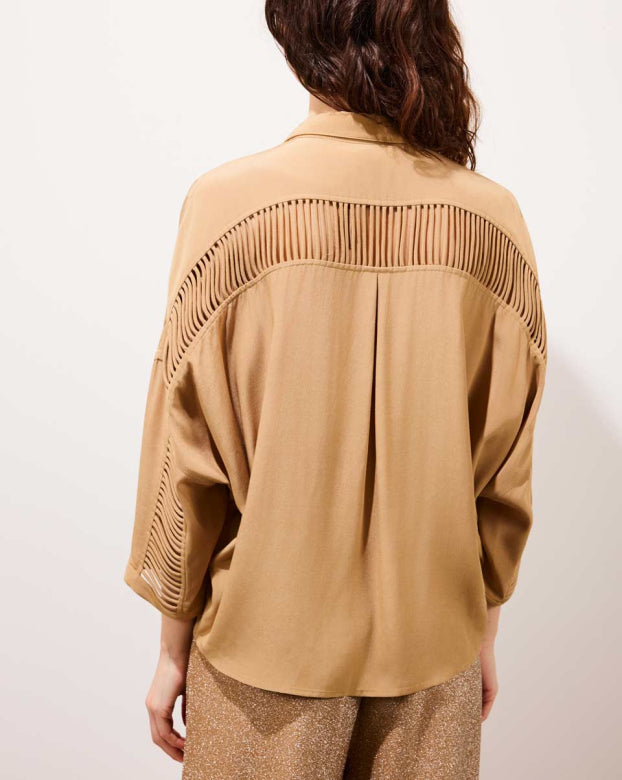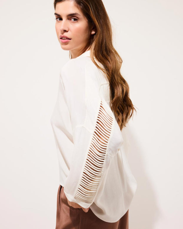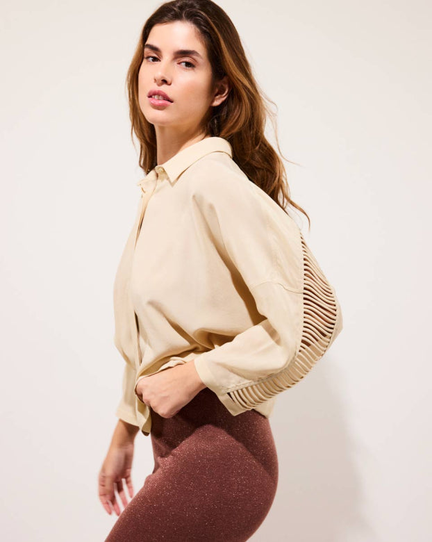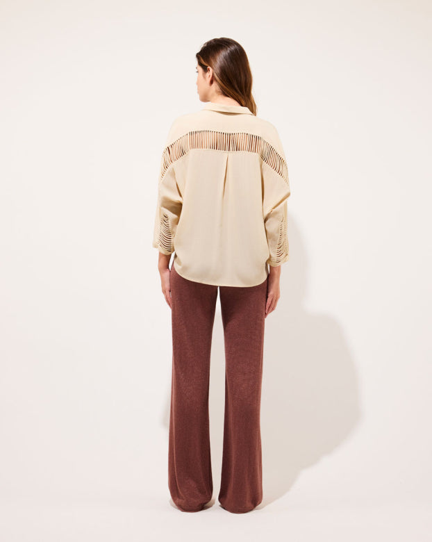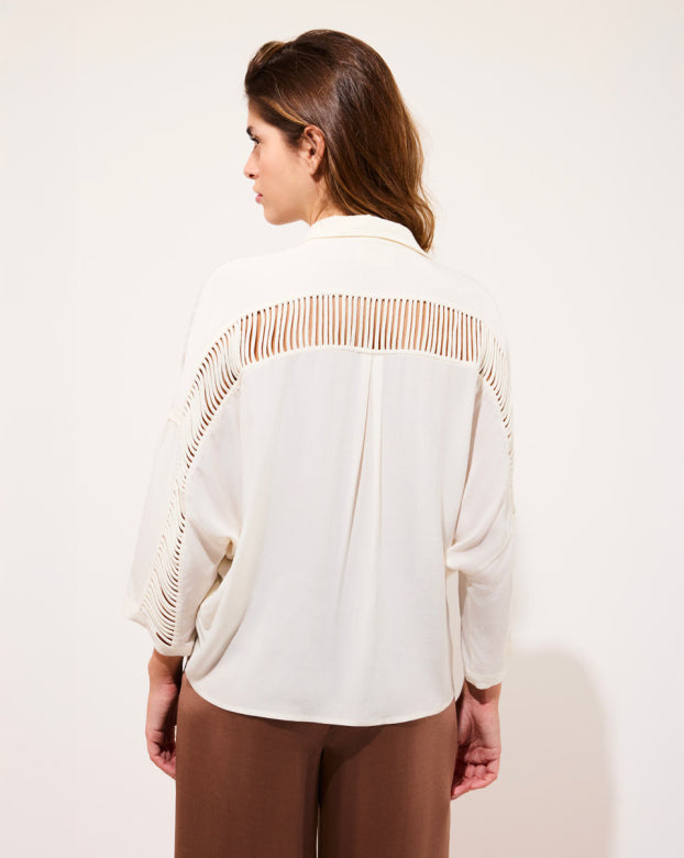 Best-seller of the brand, the CLARA shirt revisits an essential of the feminine wardrobe with audacity. Its oversized cut brings a supple fullness, ideal for a relaxed yet refined silhouette. The openwork detail on the back and on the sleeves breathes a discreet sensuality, signature of Karma Koma. She is as well tucked in high-waisted pants as floating on straight jeans.