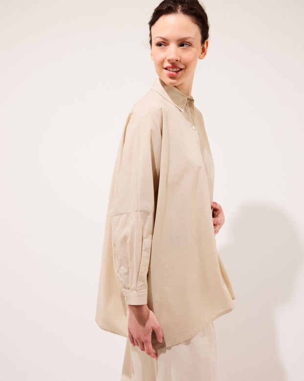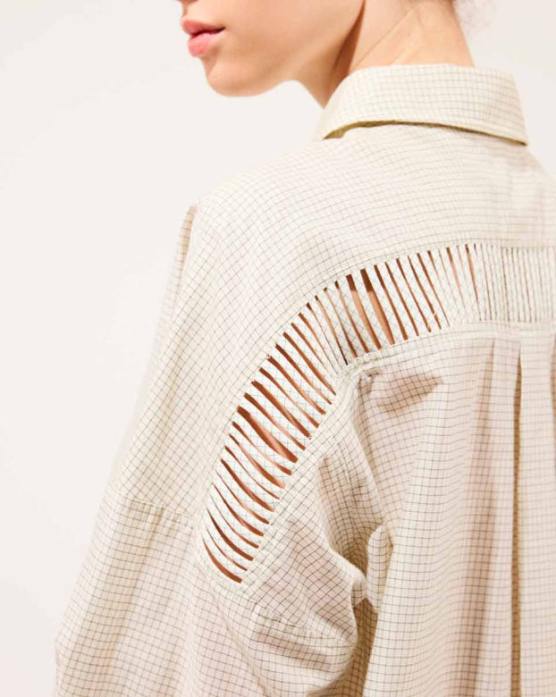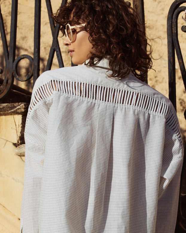 The Pierre shirt has an oversized cut that brings a subtle fullness, ideal for a relaxed yet refined silhouette. The openwork detail on the back and on the sleeves breathes a discrete sensuality, signature of Karma Koma.