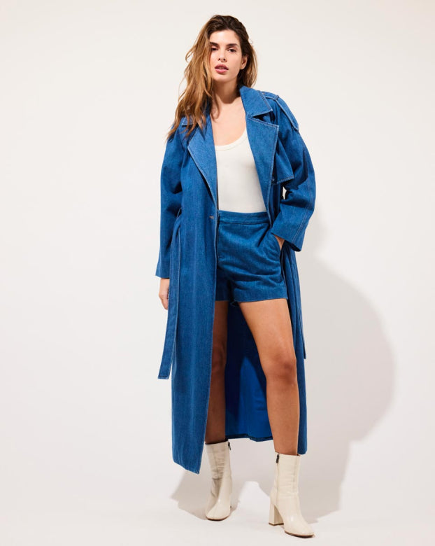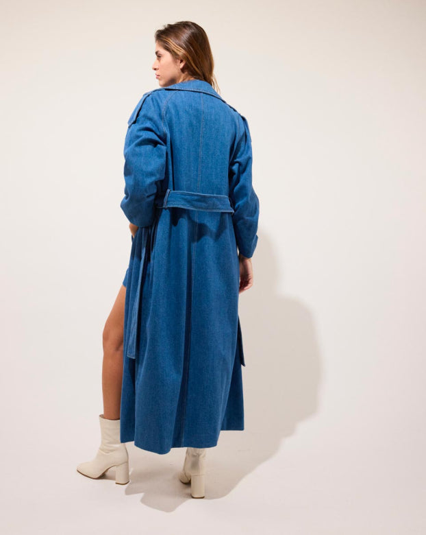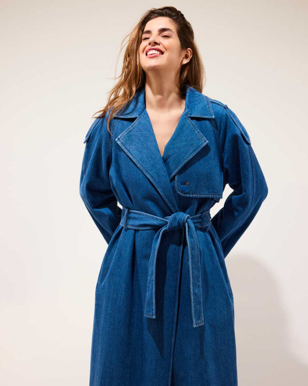 A classic trenchcoat in denim with a classic cut and subtle details. The Sunday jacket has a belt that allows you to tighten the coat at the waist, flaps across the shoulders and large pockets in front.