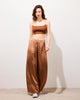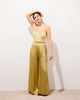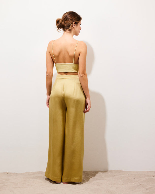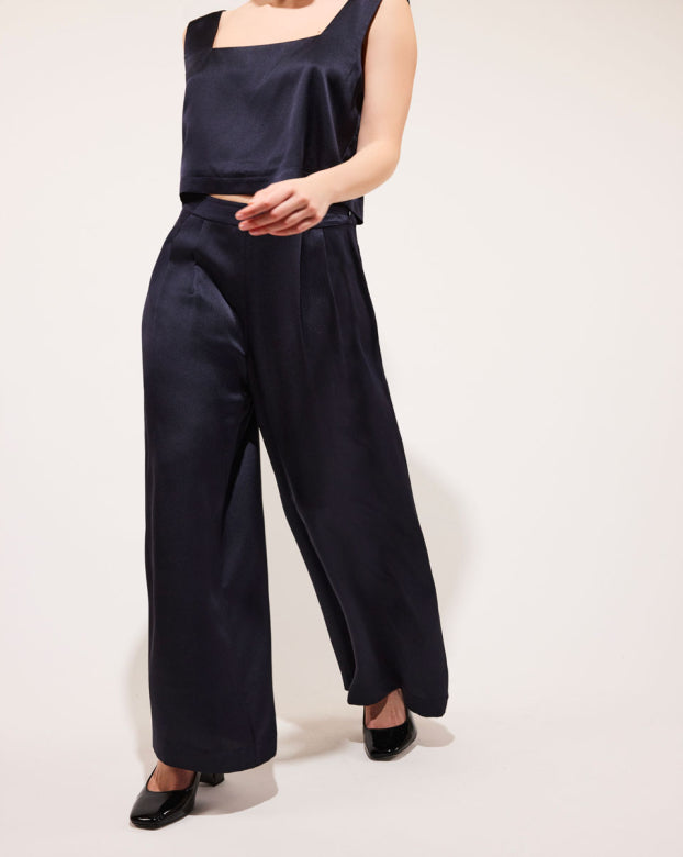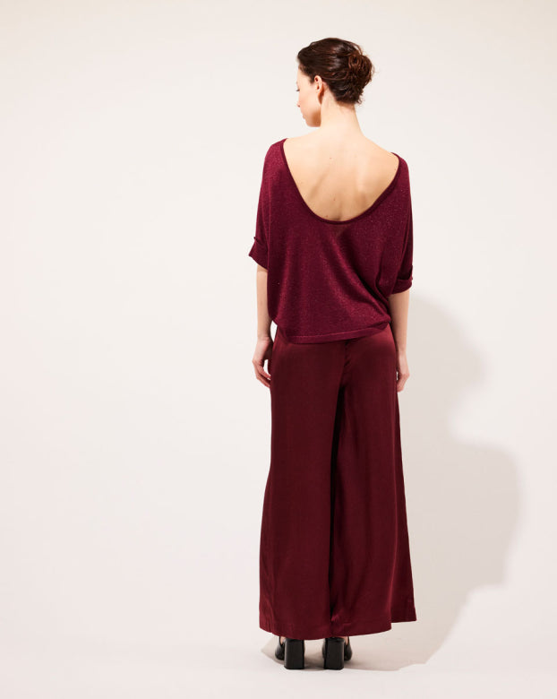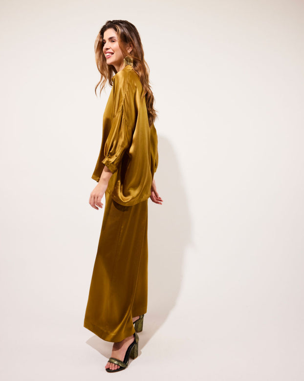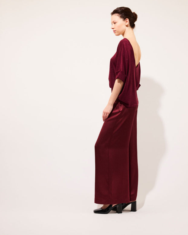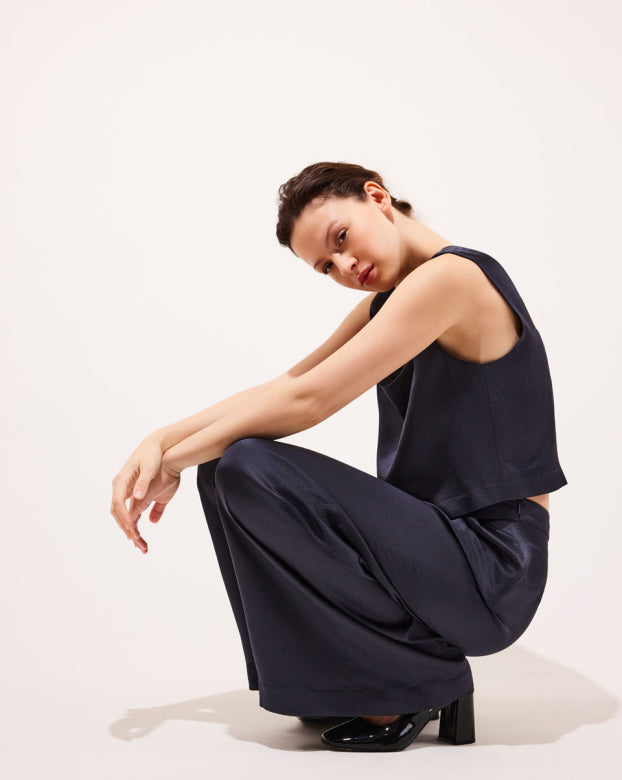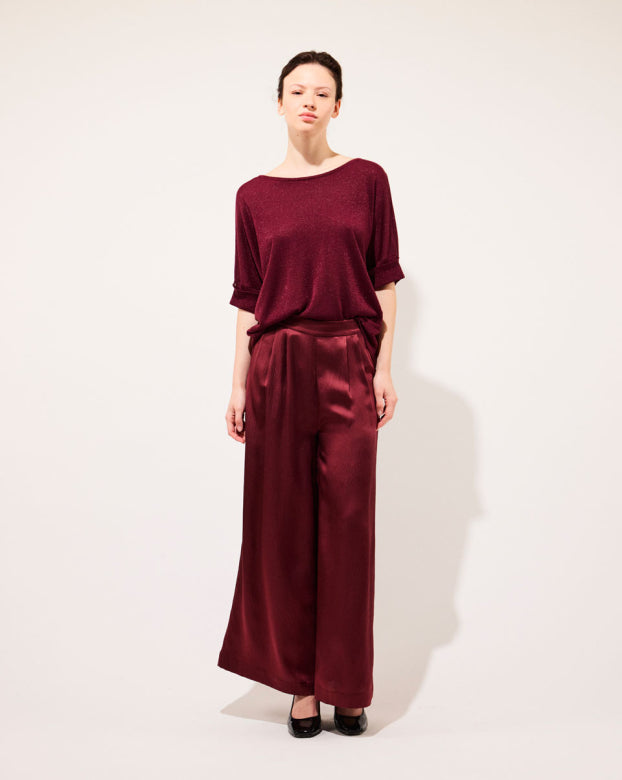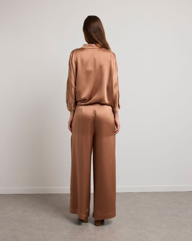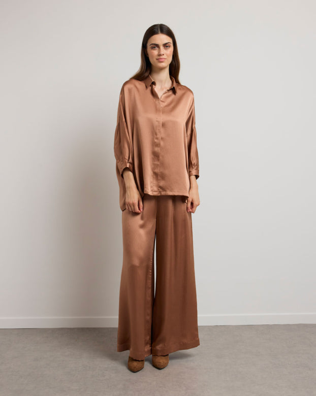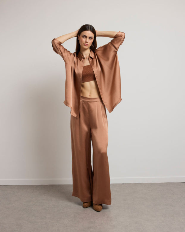 The SWAN trousers are a flared model designed for absolute comfort. Crafted from pleasant silk that glides on the skin with an embossed appearance for added refinement. The wide-flared design offers elegance and ease of movement, making them a mid-season essential. You can pair these bottoms with a close-fitting top to create contrast or opt for an ultra-oversized monochrome look with the Manon shirt.